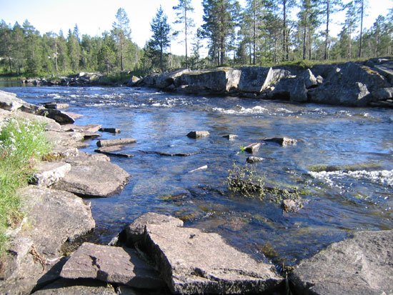Im Sveningdalen geht es an einem Fluß mit vielen Stromschnellen entlang. Wir halten an einem kleinen Parkplatz links der Straße an einigen spektakulären Stromschnellen. Über Felsen fällt das Wasser in Stufen hinab. Die Felsen sind schön warm und wir machen hier eine ausgiebige Pause. Einen weiteren Stop machen wir am Laksfors Wassserfall. Ein sehr schöner Wasserfall an dem man die Lachse beim Hochspringen beobachten kann. Ein beeindruckendes Schauspiel.