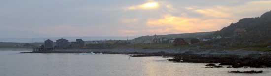Für uns heißt es wieder zurück durch den Tunnel und weiter die 39 km nach Hamningberg. Die Fahrt geht durch eine so genannte Mondlandschaft, vorbei an wilden zerklüfteten Felsen auf einer engen 1-spurigen Straße. "Varanger - Das Land in dem die Steine gen Himmel wachsen." Zwischen den Felsen werden immer wieder neue Häuser gebaut. Für uns unverständlich was die Leute hier wollen. Bei Sandfjord sehen wir einen traumhaften langen Sandstrand. Aber man darf nicht vergessen, das ist hier die Barentsee. Am Ende der Straße liegt Hamningberg. Dieser legendäre ehemalige Fischerort erweckt langsam wieder zum Leben. Immer mehr Häuser werden renoviert. Heute am Samstag ist es hier richtig lebendig. Im kleinen Dorfladen werden gerade frische Waffeln gebacken, dazu gibt es Kaffee. Wir gönnen uns eine Pause. Hamningberg, End of Europe - so steht es draußen auf einem Schild. Drinnen gibt es passende T-Shirts, die wir für uns mitnehmen. Vorne an der nicht fertiggestellten Kaimauer haben wir einen schönen Blick über den verträumten Ort. Dann sehen wir die Narvik vorbeifahren, die wir heute mittag bereits in Vardø gesehen haben.